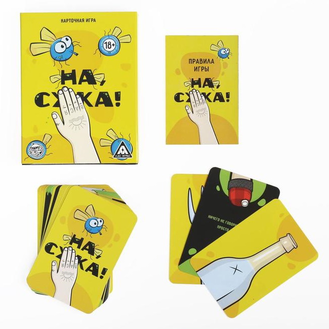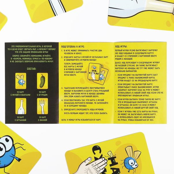 Точно, в игре ещё есть карточки с надоедливой мухой и фантами. Если один из игроков вытянул эту карту, то все участники должны как можно быстрее хлопнуть ладошкой по колоде, громко выкрикнув при этом название игры.
