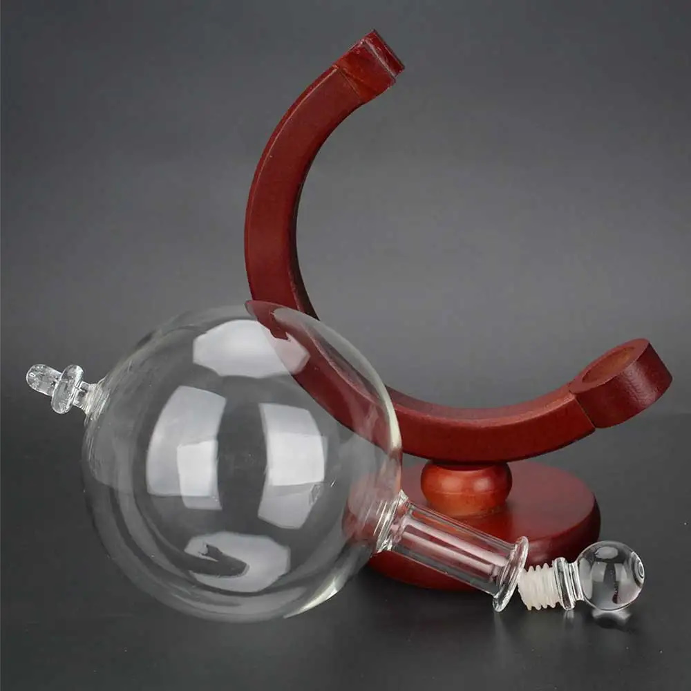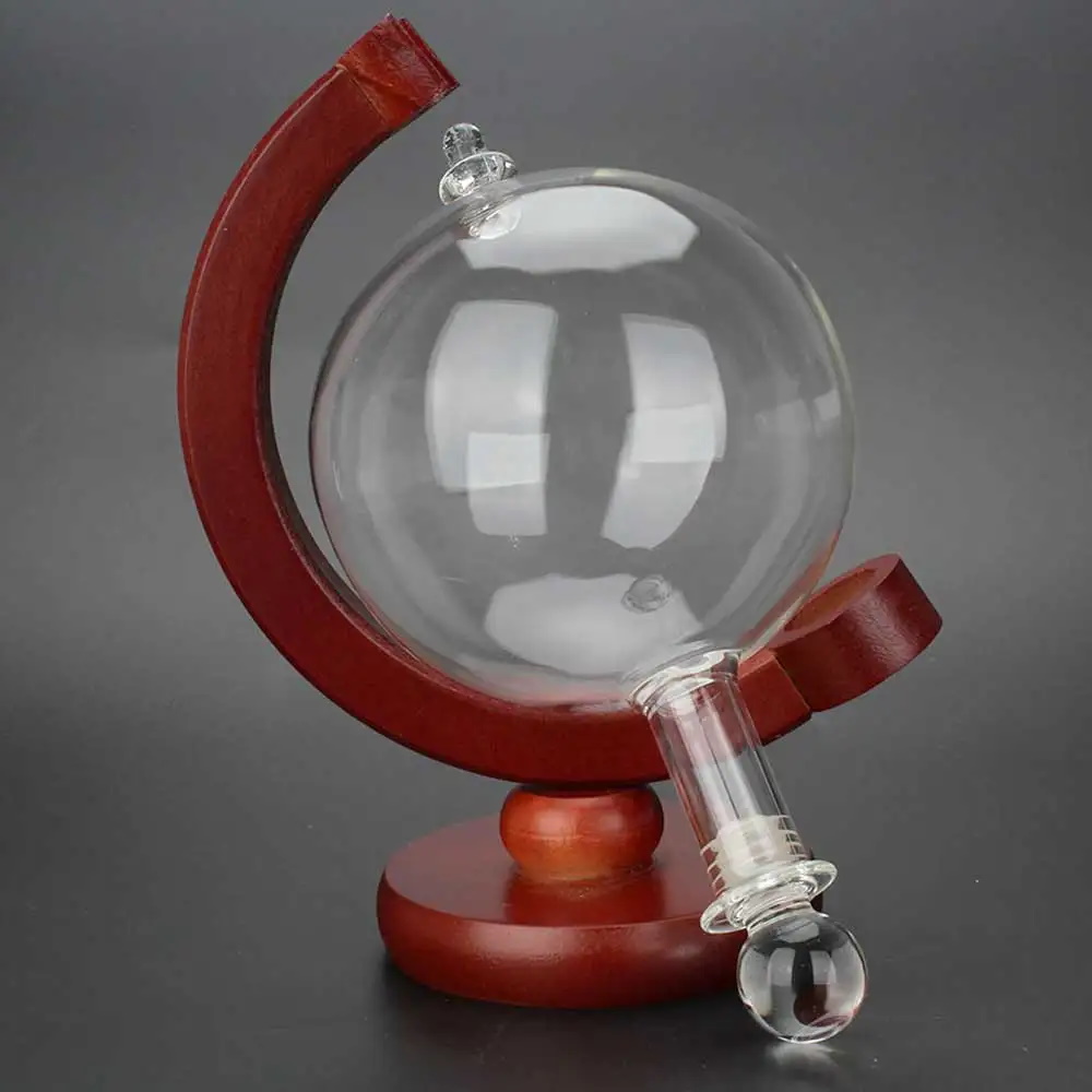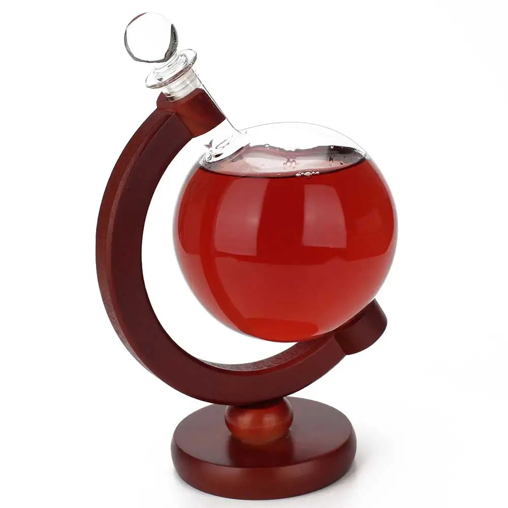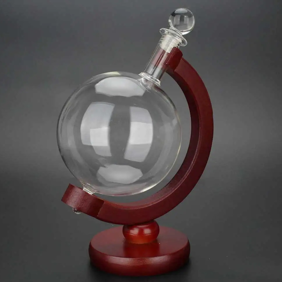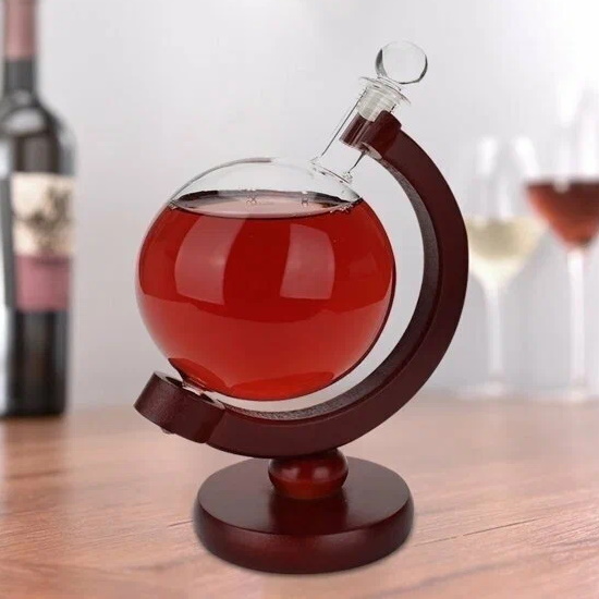Оригинальный графин для крепких напитков в форме стеклянного глобуса на деревянной подставке.