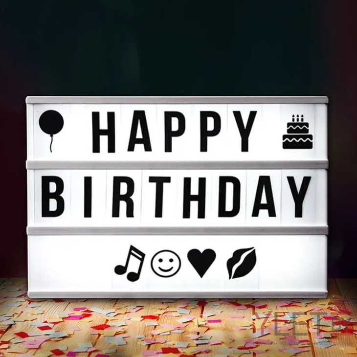 Светодиодная доска для записей LED со съемными буквами цифрами и символами , сделана в стиле вывесок ретро кинотеатров. Так просто написать послание близкому человеку на лайтбоксе с помощью набора букв и значков. Поздравьте с Новым годом, Днем рождения, Рождеством, Днем матери, пожелайте хорошего дня, напомните о важном дне или просто оставьте смайлик!