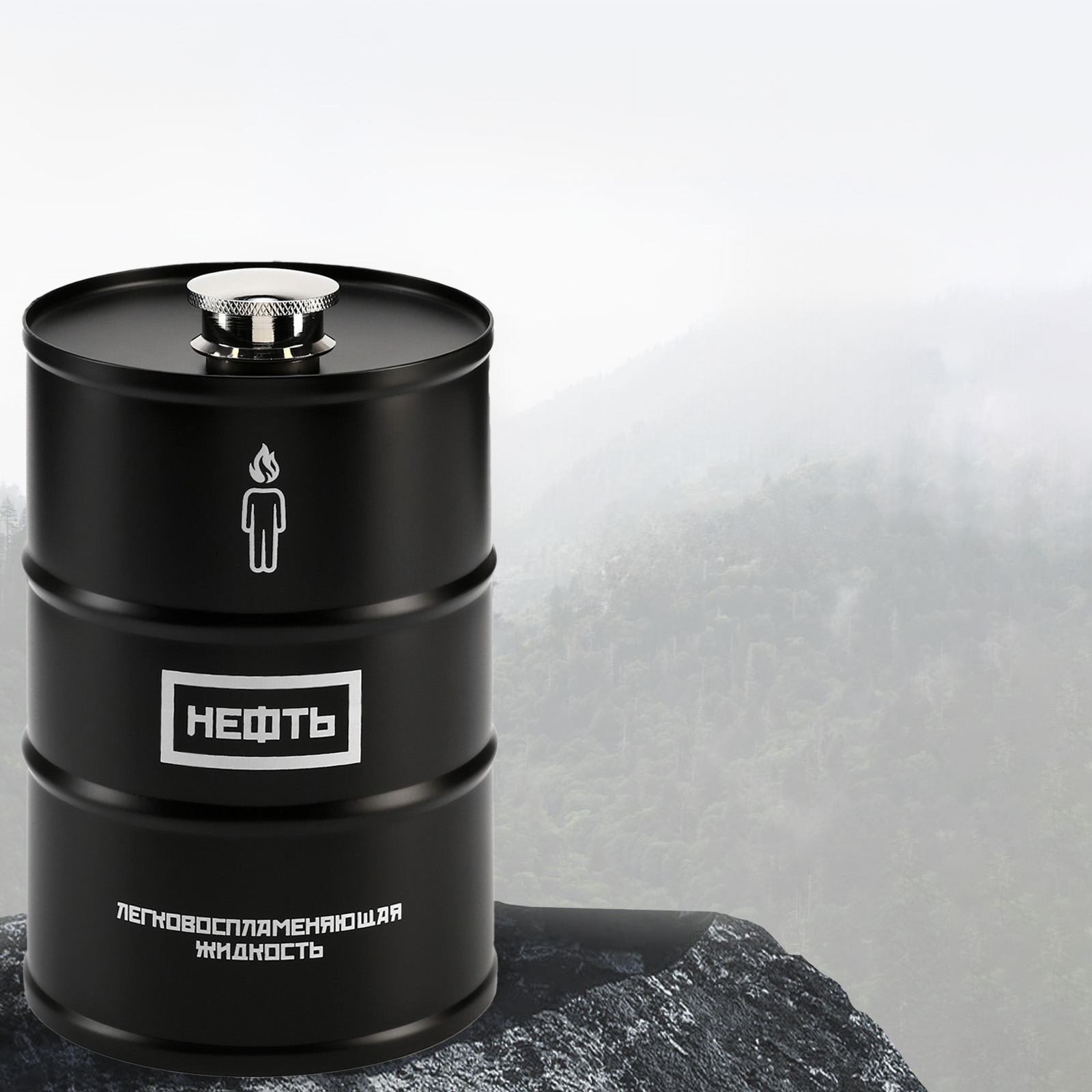 - Дизайн: Оригинальная форма в виде топливной бочки черного цвета с белыми надписями придаёт фляжке стильный и необычный вид.