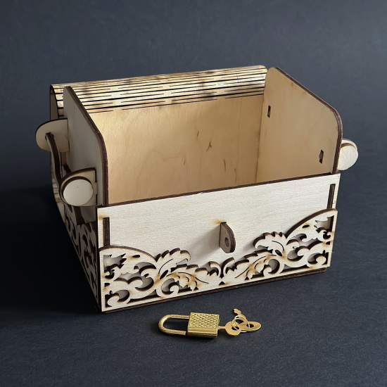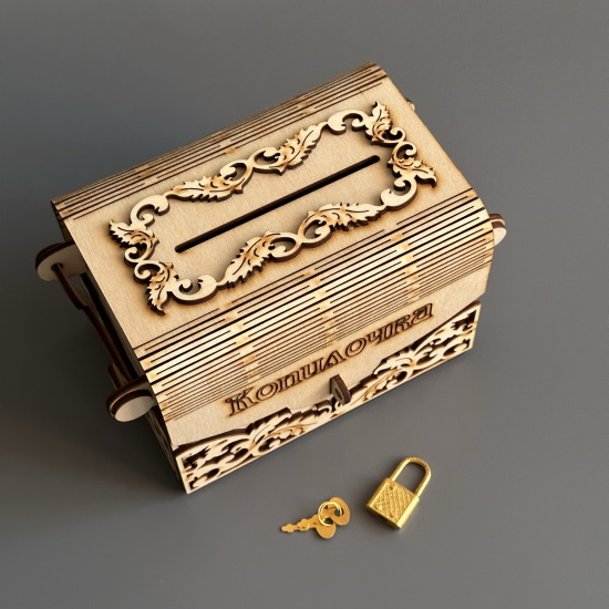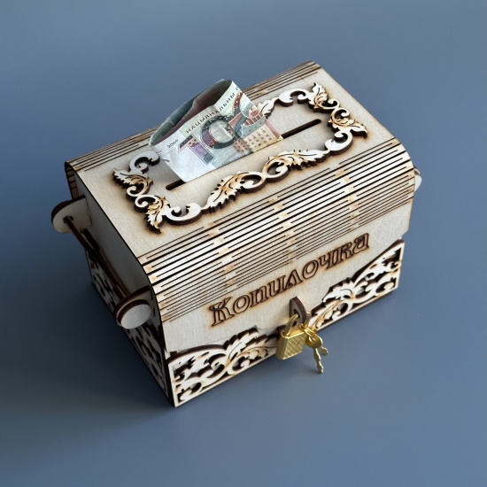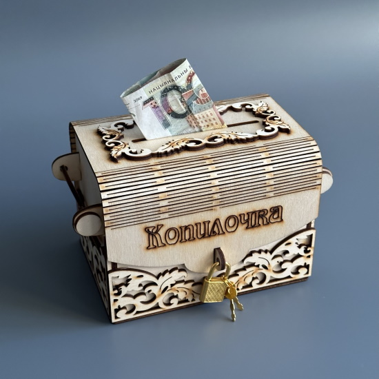 Копилка для денег "Копилочка" выполнена из натурального дерева в виде сундучка. На передней части копилки сейфа есть функционирующий замок золотого цвета. В комплекте присутствуют два ключа такого же цвета.
