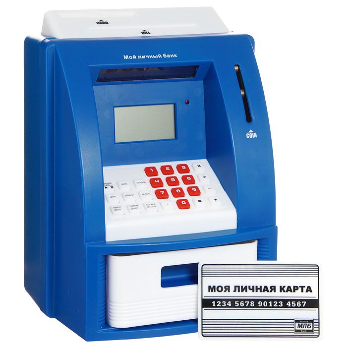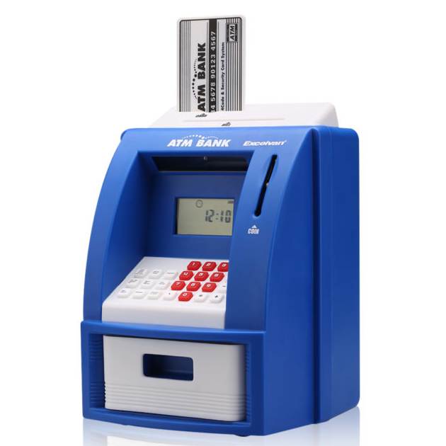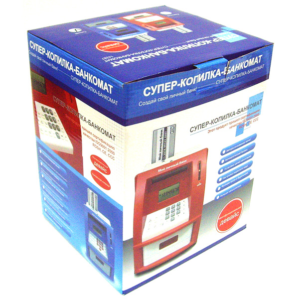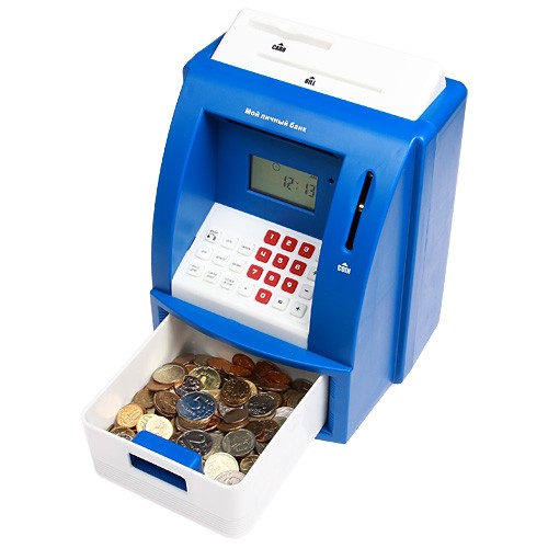 Электронная копилка "Банкомат", несомненно, привлечет ваше внимание. Копилка выполнена в виде банкомата, оснащенного жидкокристаллическим дисплеем, клавиатурой, слотом для пластиковой карты, слотом для купюр и отделением для монет. Кроме того, копилка имеет ряд дополнительных функций: калькулятор, часы с будильником, также можно задать функцию "накопления" и настроить персональный.