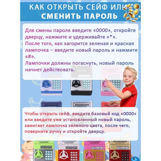 Хотите сделать оригинальный и полезный подарок своим близким или детям? Тогда обратите внимание на нашу хитовую электронную сейф-копилку для денег! Это уникальное изделие, которое не только сохранит ваши сбережения, но и станет настоящим предметом интереса. Наша копилка работает от батареек и принимает как монеты, так и бумажные купюры. Ее дизайн напоминает настоящий сейф с кодовым замком и электронным купюроприемником. К тому же, она обладает музыкальным сопровождением, что придаст особый шарм вашему процессу накопления. Открыть ее может только человек, который знает пин-код сейфа. По умолчанию он установлен как "0000". Но мы предусмотрели возможность смены ПИН-кода. Для этого нужно всего лишь открыть дверцу вводом кода 0000, дождаться, пока светодиод погаснет, затем нажать и удерживать кнопку "*" в течение 10 секунд. После этого введите новый 4-значный код и нажмите "#". Отпустив кнопку "*", вы убедитесь, что код на сейфе успешно изменен.