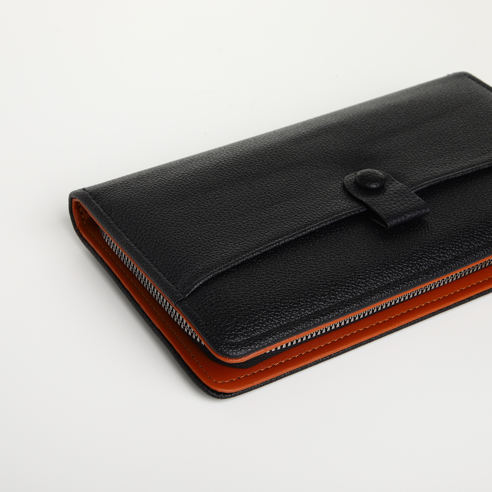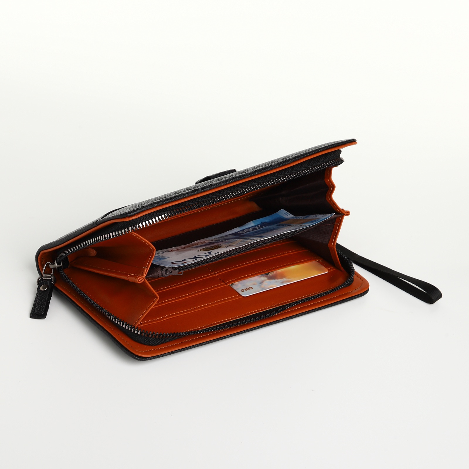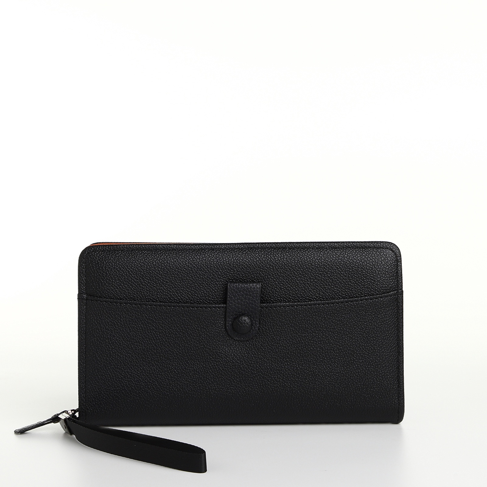 Этот чёрный клатч с молнией создаёт минималистичное решение для платежных средств. Единое отделение организует банкноты и карты в строгом порядке. Молния по периметру защищает содержимое, сохраняя лаконичную форму аксессуара. Универсальный цвет сочетается с деловым и повседневным гардеробом.
