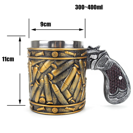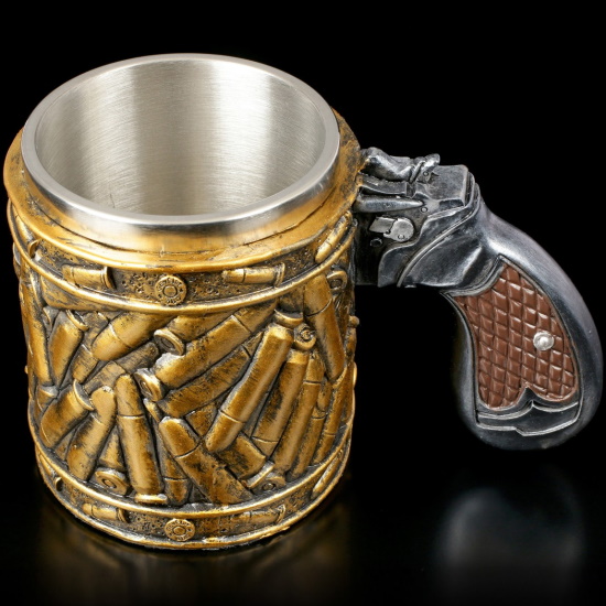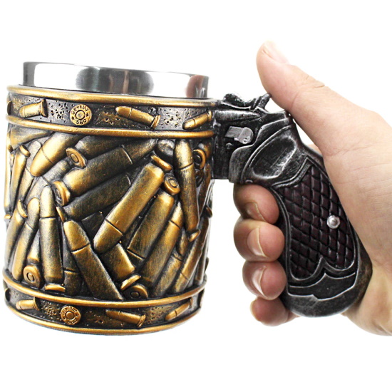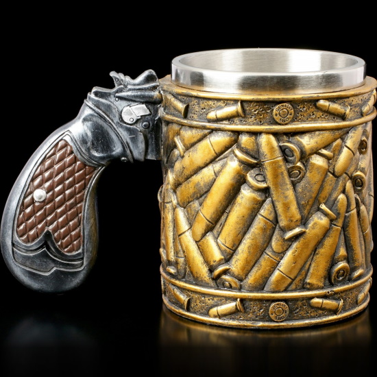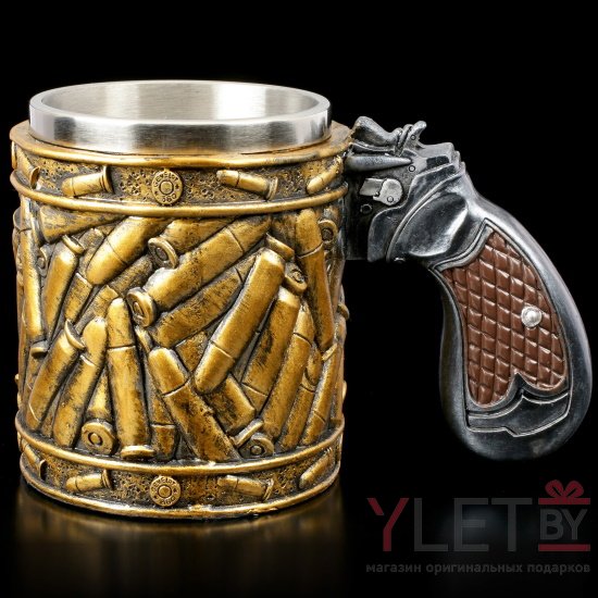 Оригинальная кружка с патронами и ручкой в виде рукояти револьвера. С таким аксессуаром вы точно не останетесь незамеченным ни дома, ни в офисе. Взгляды окружающих будут направлены на очень эффектную чашку.