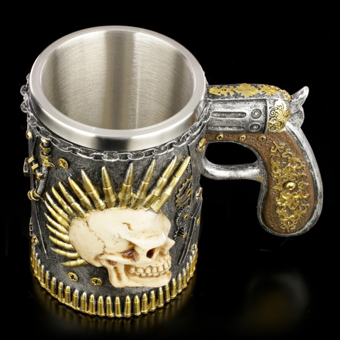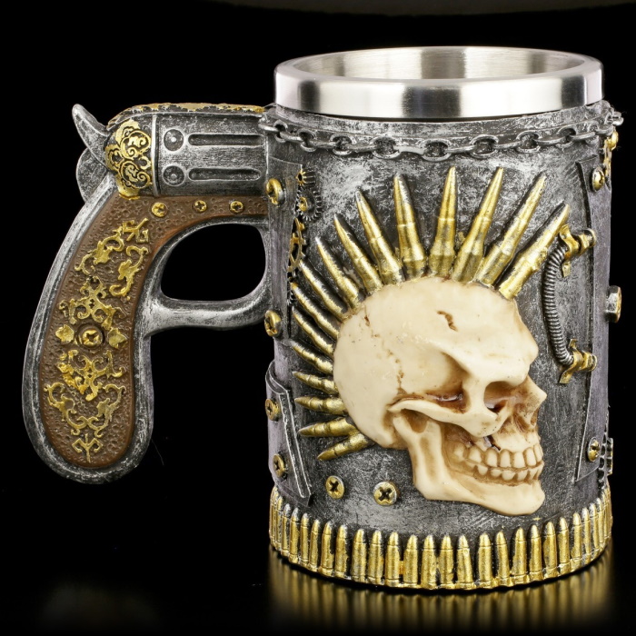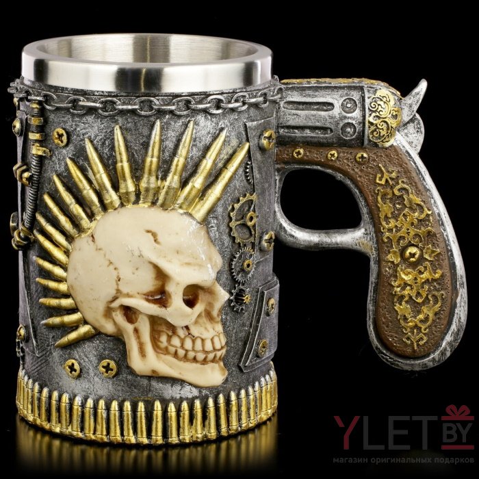 С обеих сторон этой кружки изображены черепа, окруженные пулями. Ручка выполнена в виде рукоядки пистолета.Из кружек, на которых появляются причудливые, рельефные изображения, способные, в свою очередь, изменить форму самой кружки, пить хочется как можно чаще. Держать их в руках, следуя изгибам и выпуклостям – приятно невероятно.