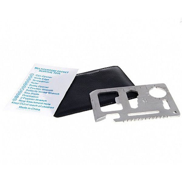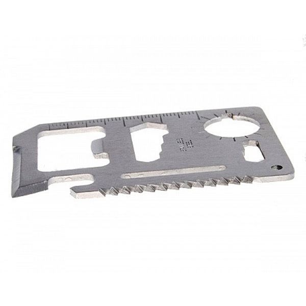По внешнему виду это небольшая металлическая карточка, которую можно без труда положить в карман рюкзака или брюк, прикрепить к ключнице или поместить в "бардачок" автомобиля. На рабочем поле карточке расположеныотверстия и выемки, превращающие ее в универсальный инструмент для похода, состоящий из:
