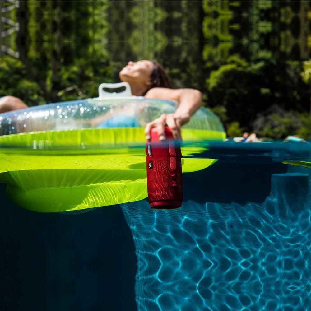 Компактность и легкость ещё больше привлекает пользователей, так как облегчает процесс эксплуатации данного устройства.Высокопрочная ткань и водонепроницаемый прорезиненный корпус колонки JBL Charge 3 позволяют наслаждаться качественным звуком в любом месте - у бассейна, на пляже, на даче. И не важно, идёт дождь или нет.