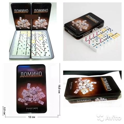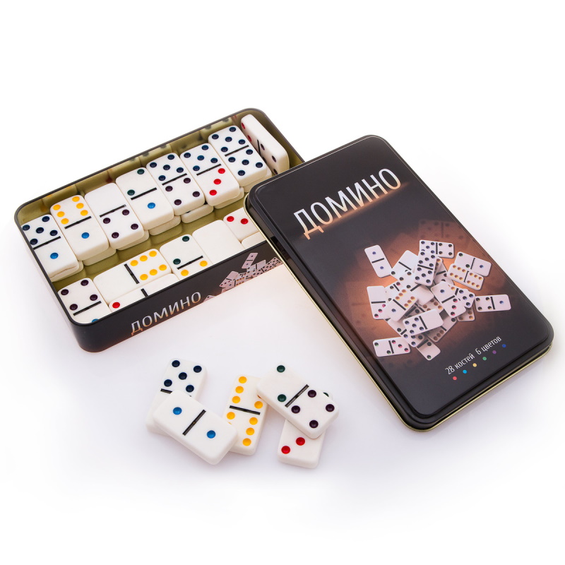 Упаковано домино в металлическую коробку. Состоит из 28 костей,6 цветов. Размер коробки: 12х 19,5 х 3.5 см