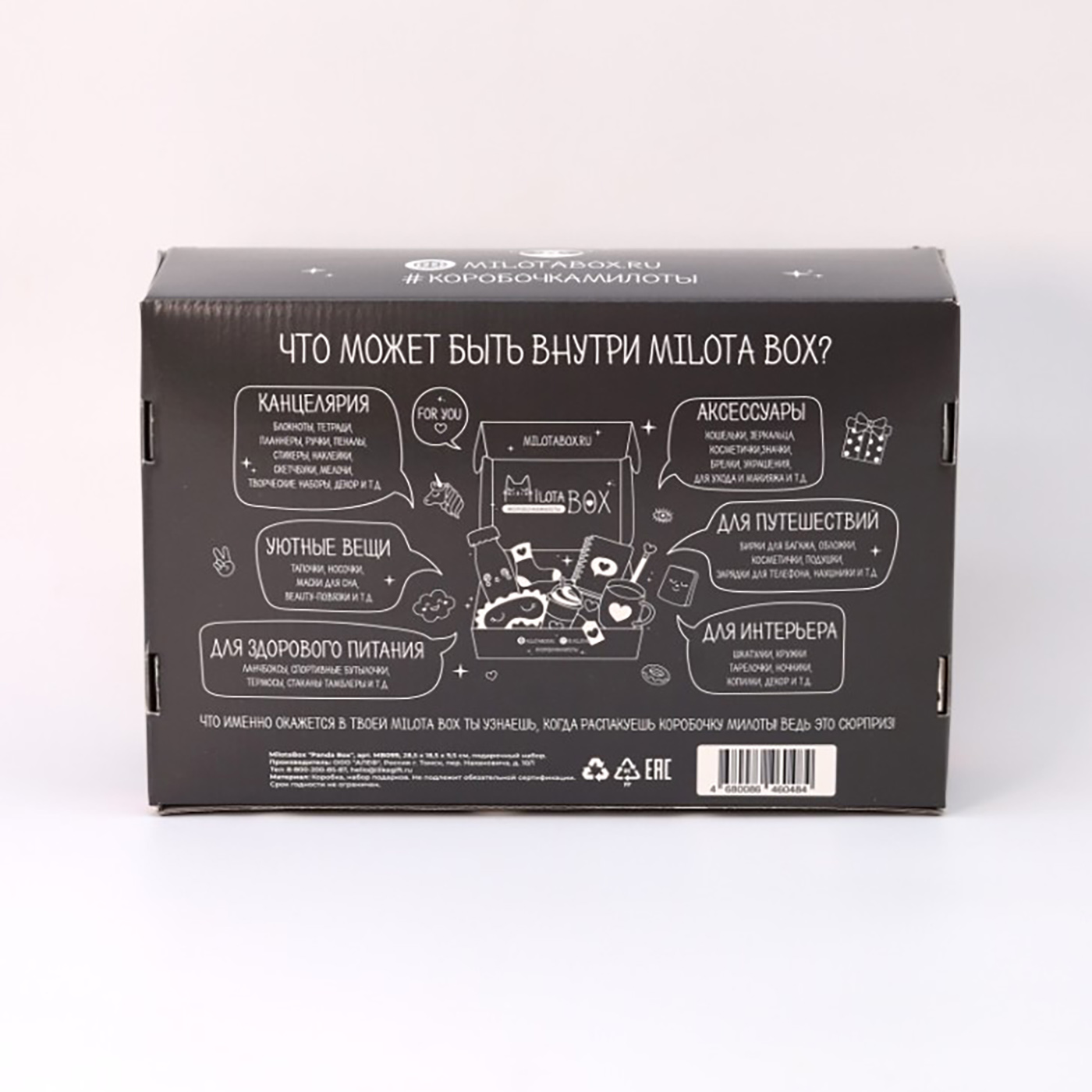 Каждая коробочка MilotaBox — это маленький магический мир, наполненный уникальными предметами, которые помогут сделать повседневную жизнь более яркой and насыщенной. Вы сможете насладиться милой канцелярией, уютными аксессуарами для дома, стильными деталями и предметами, способствующими здоровому образу жизни. Наполнение вновь удивляет разнообразием и количеством сюрпризов!