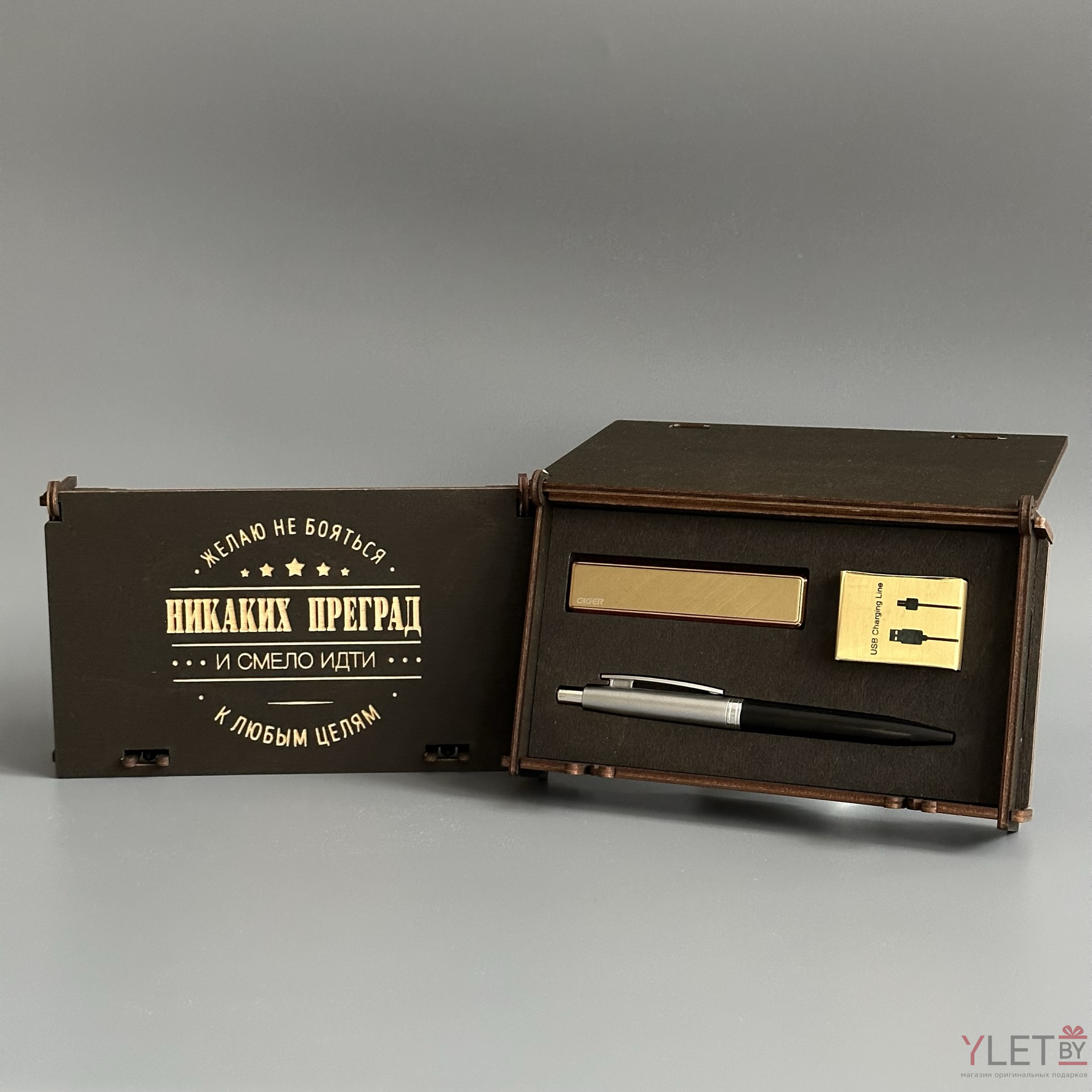 Набор упакован в стильную и презентабельную коробку, которая подчеркивает его статусность и готовность к вручению. "Никаких преград" — это не просто подарок, а утверждение о том, что все препятствия можно преодолеть с правильными инструментами и настроем.