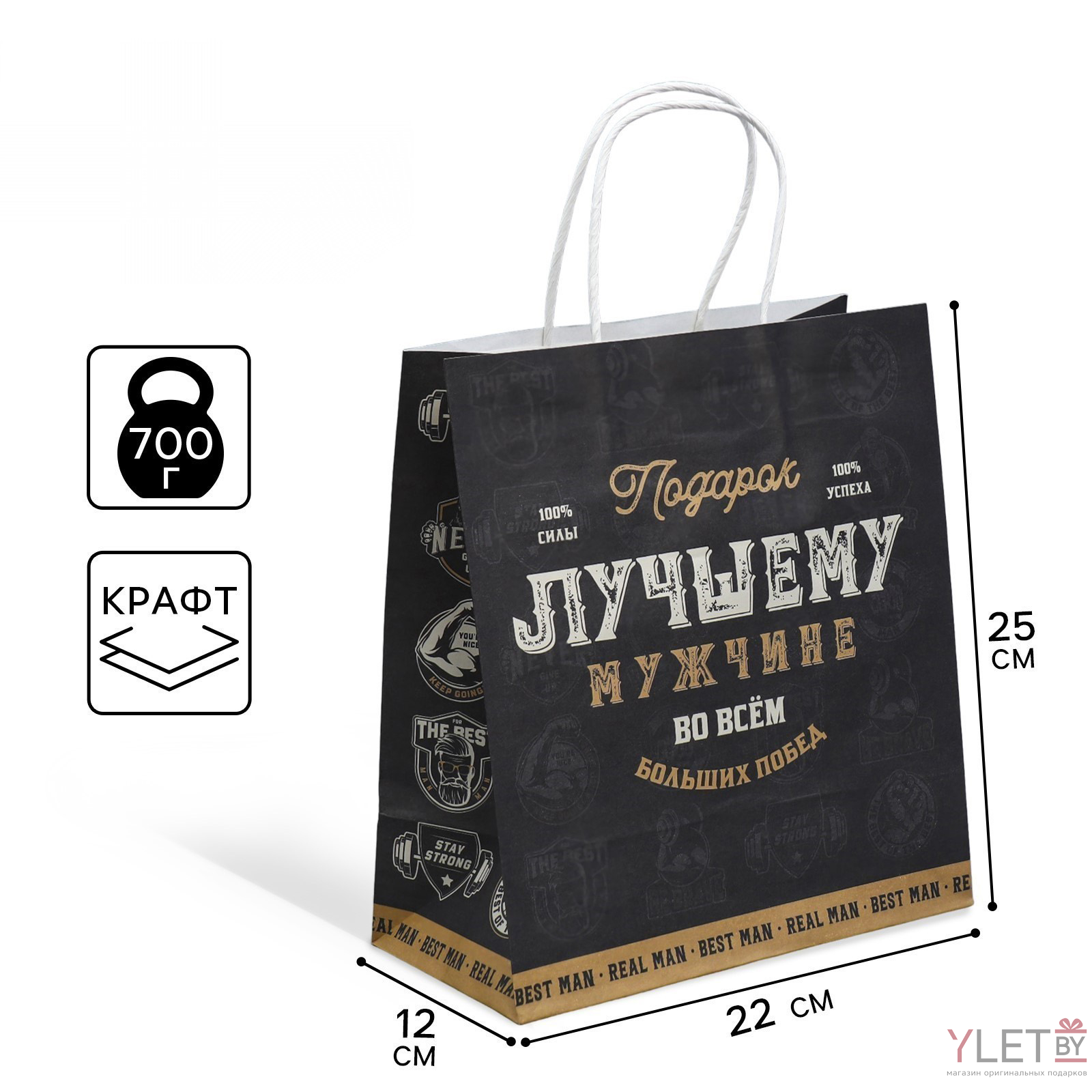 Этот элегантный крафтовый пакет станет идеальным решением для упаковки подарков, предназначенных для настоящих мужчин. С размером 22 х 25 х 12 см, он отлично подходит для различных сюрпризов, будь то аксессуары, косметика, книги или алкогольные напитки.