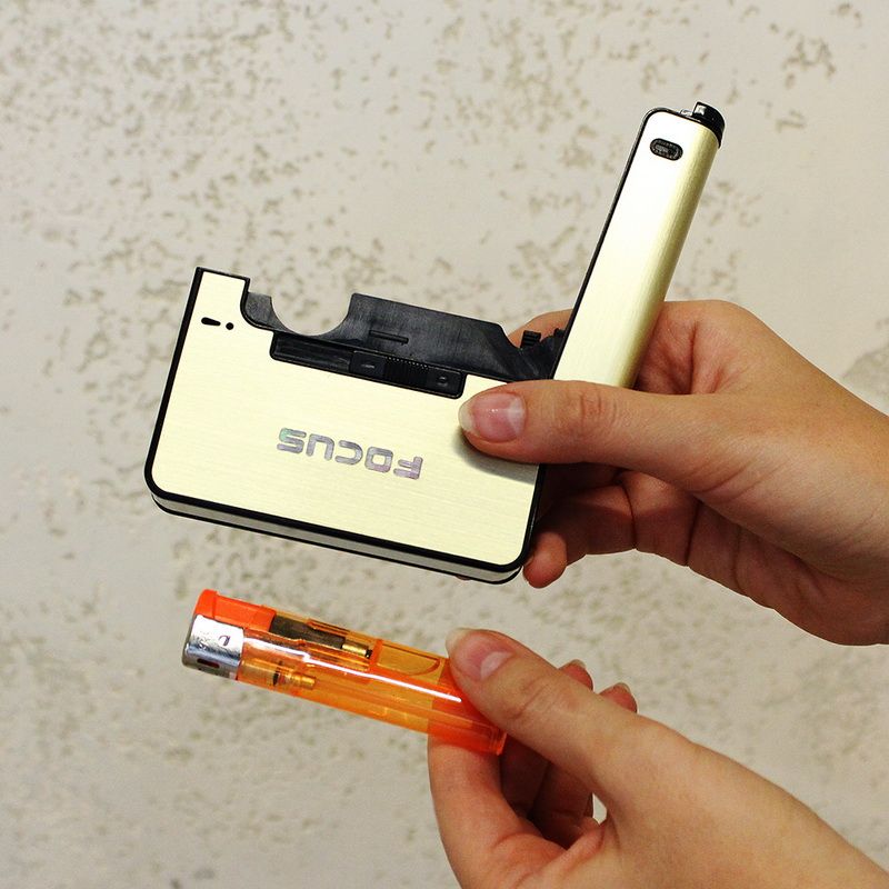 Портсигар Focus - это не тот портсигар, к которому все давно привыкли, то есть примитивная коробочка для сигарет; это портсигар, который, при помощи легкого движения пальца, автоматически выдает сигарету и, при обратном движении включает зажигалку. Поместить сигареты в портсигар не составит особого труда никому: вверху приспособления имеется кнопка с треугольником, нажав на которую и, при этом, оттянув левую часть портсигара Вы сможете открыть его, поместив сигареты во внутрь, можно смело закрыть портсигар.