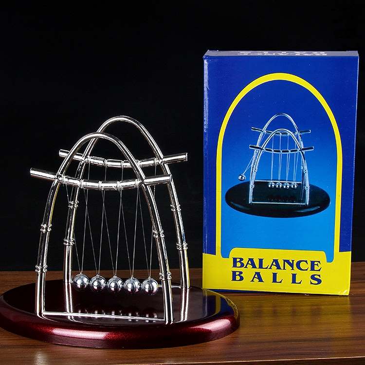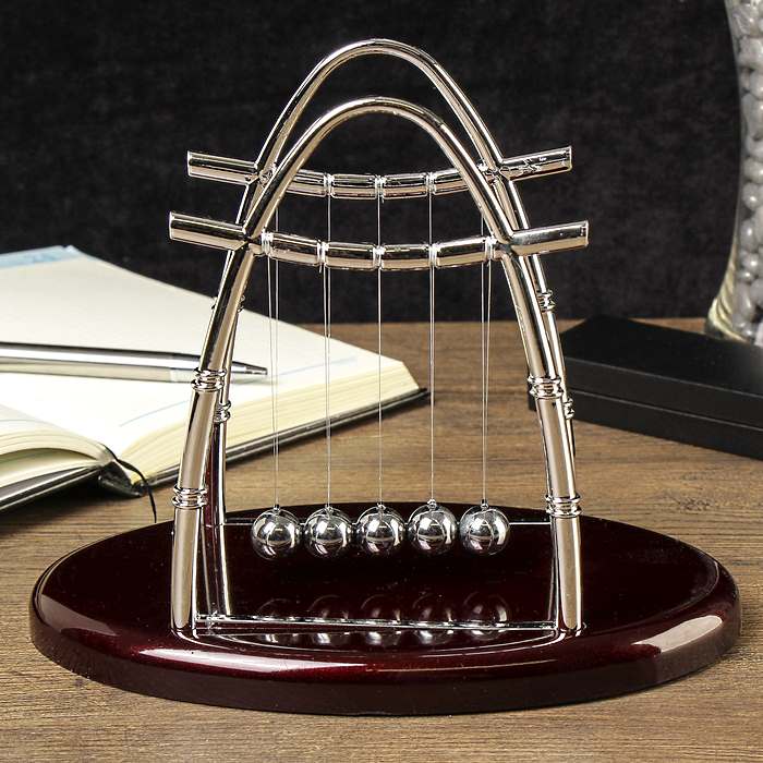 Необыкновенные шары Ньютона - помогут избавиться от стресса, сосредоточиться на важной мысли или, наоборот, расслабиться и отдохнуть под мерное движение шариков. Маятник Ньютона представляет собой предмет для визуализации физических процессов - закон сохранения энергии и закон сохранения импульса.Один из таких настольных антистрессов из ряда сувенирных «вечных двигателей» называют «Шары Ньютона». Эта игрушка, конечно, не зарядит ваш мобильный телефон или ноутбук, зато у нее занимательная конструкция, а еще ею просто приятно любоваться.Оригинальный настольный сувенир "Шары Ньютона" - это наглядный пример закона сохранения энергии, открытый Исааком Ньютоном. "Колыбель Ньютона" наверняка известна вам из уроков физики, где вам демонстрировали такую модель. Маятник ньютона состоит из пяти металлических шариков, подвешенных на тонкой леске к двум п-образным рамкам и своим движениям и синхронным стуком расслабляют и помогают отвлечься от негативных эмоций. Достаточно отвести и отпустить один из крайних шариков, и вы сможете наблюдать в действии физический закон сохранения энергии - с противоположной стороны шарики станут двигаться в том же ритме и зеркальном отображении.Небольшая настольная кинетическая скульптура в собранном виде демонстрирует закон сохранения энергии, открытый Исааком Ньютоном. Завораживающее медитативное постукивание блестящих шаров на Вашем столе поможет сосредоточиться при обдумывании или наоборот, расслабиться после тяжелой работы. Движение – это жизнь!Этот сувенирный вечный двигатель "Маятник Ньютона" можно преподнести в подарок бизнесмену, который на работе постоянно нервничает, или тем, кто просто любит иногда отключиться от окружающей суеты и хотя бы ненадолго уйти в свои мысли.