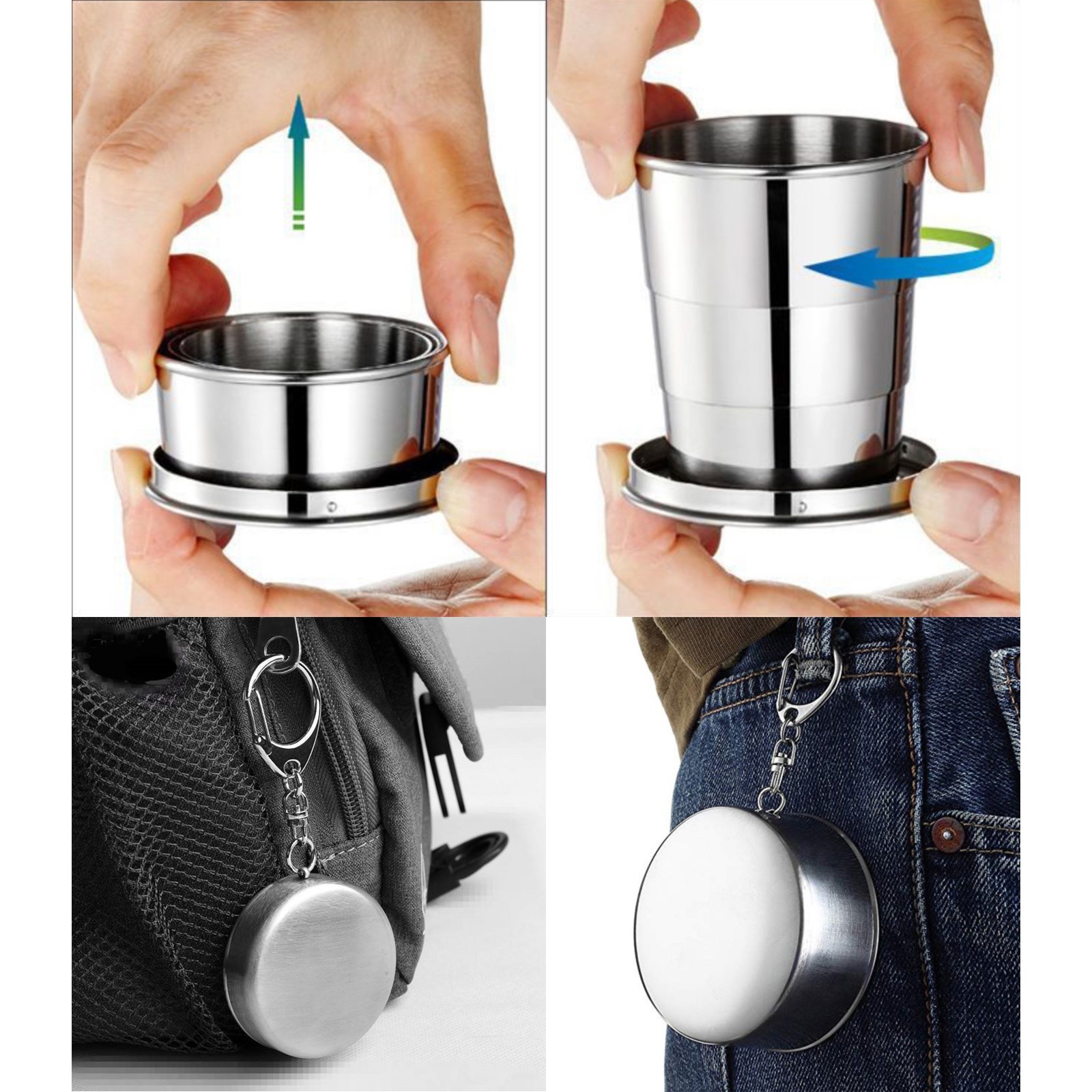 Складной дизайн позволяет компактно убирать стакан, что особенно важно во время походов. Легкость транспортировки обеспечивается возможностью складывания стакана одним движением руки, а карабин удобно прикрепляется к поясу или рюкзаку. Кроме того, стакан закрывается крышкой, что делает его компактным и защищённым.