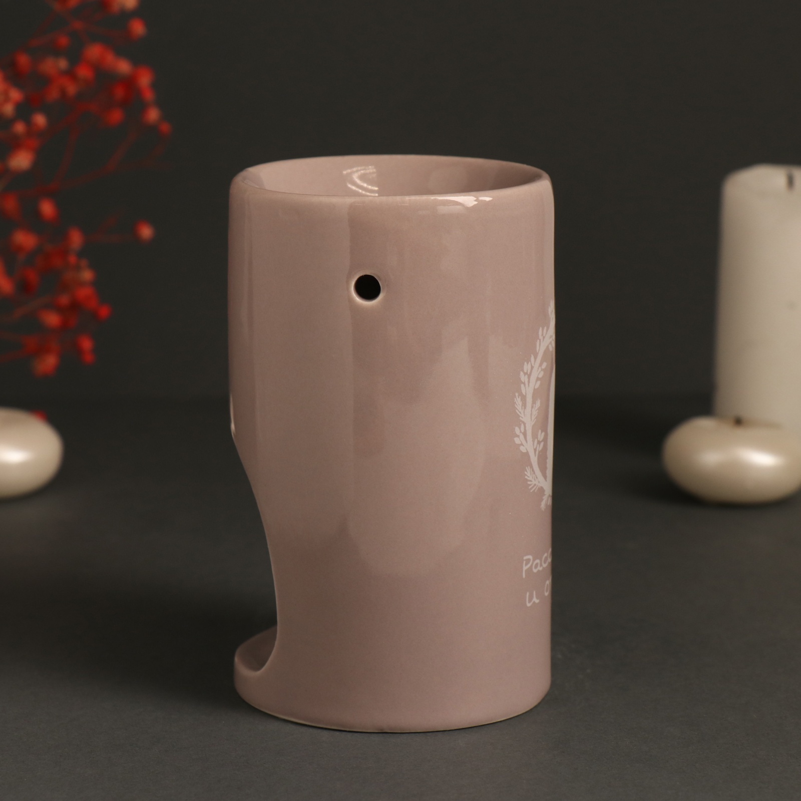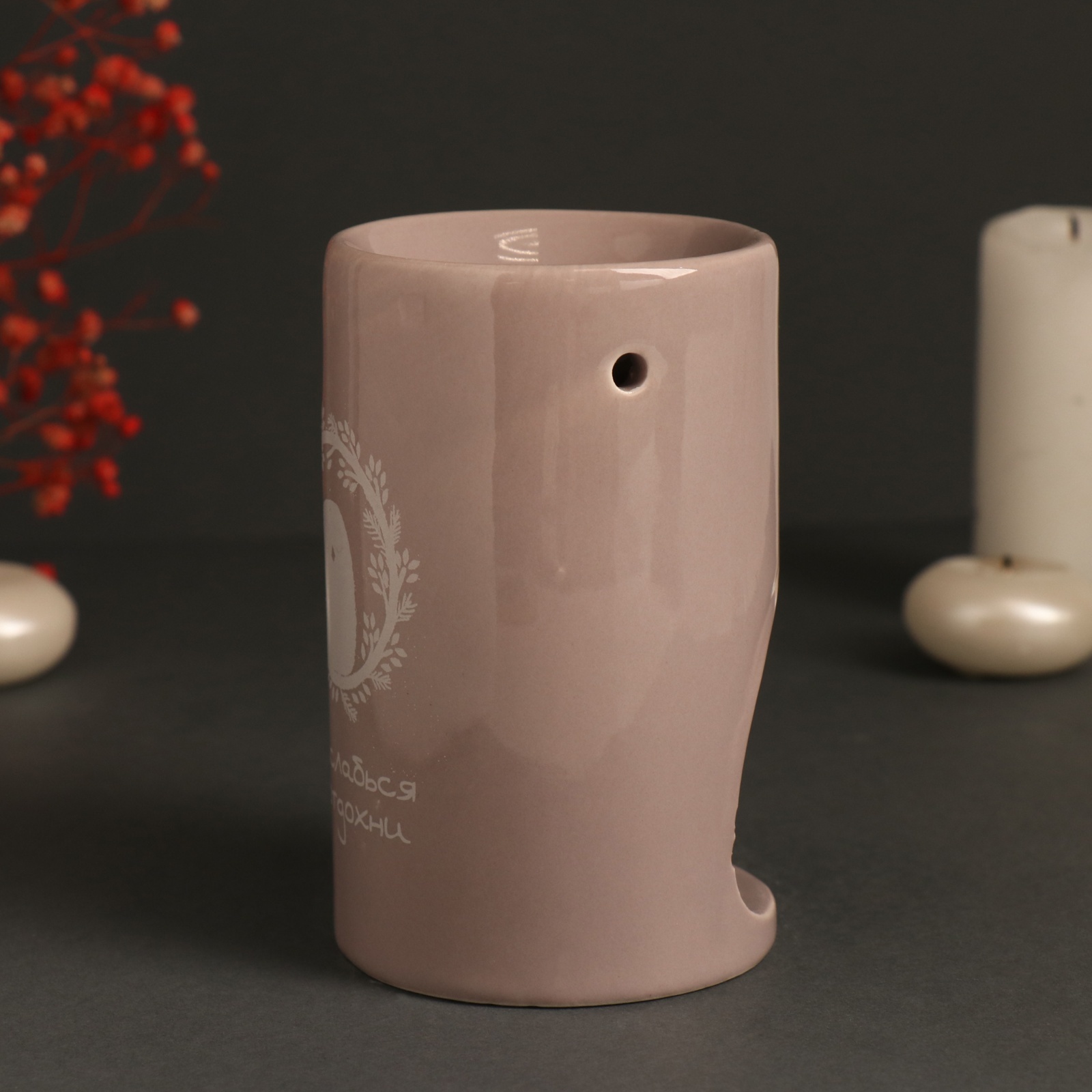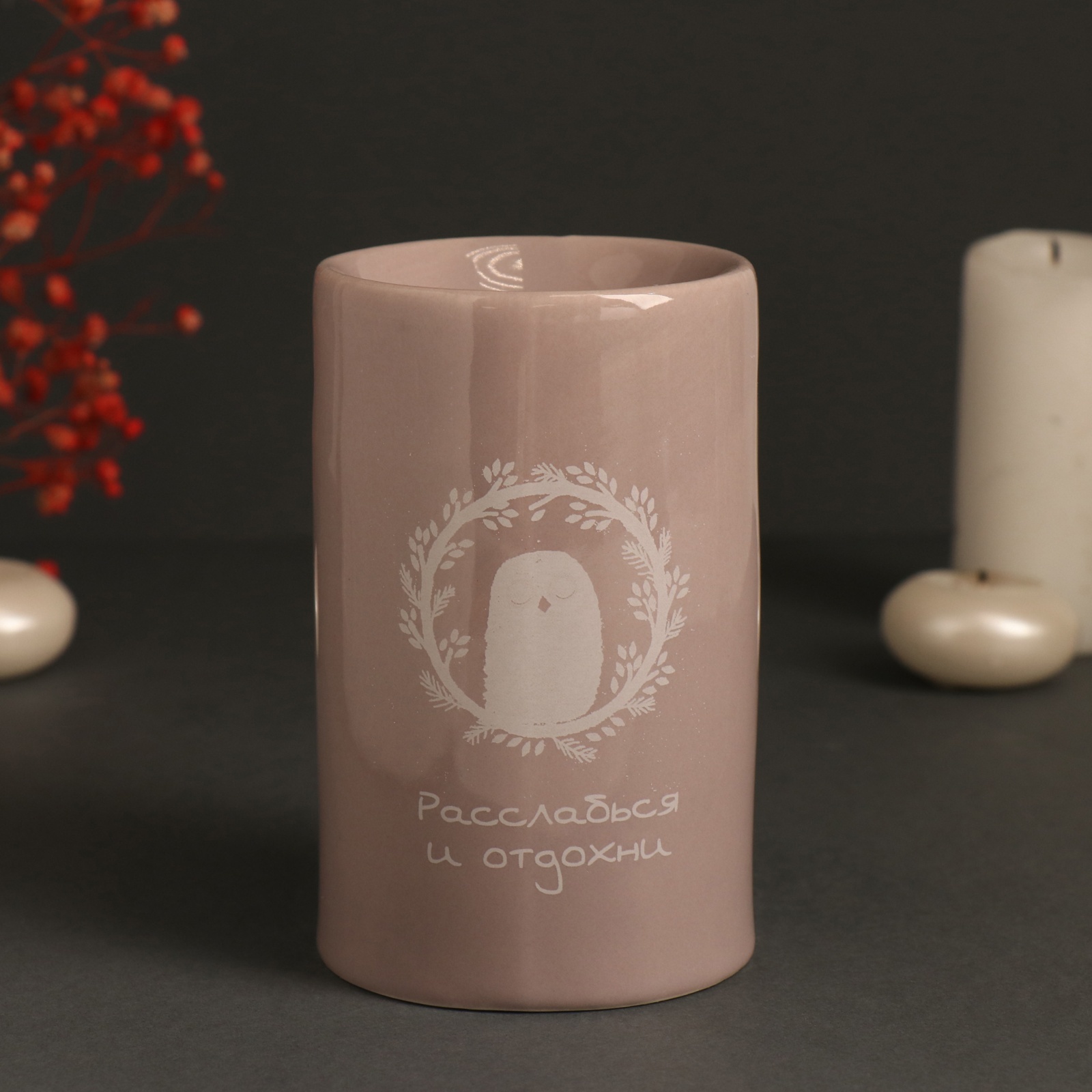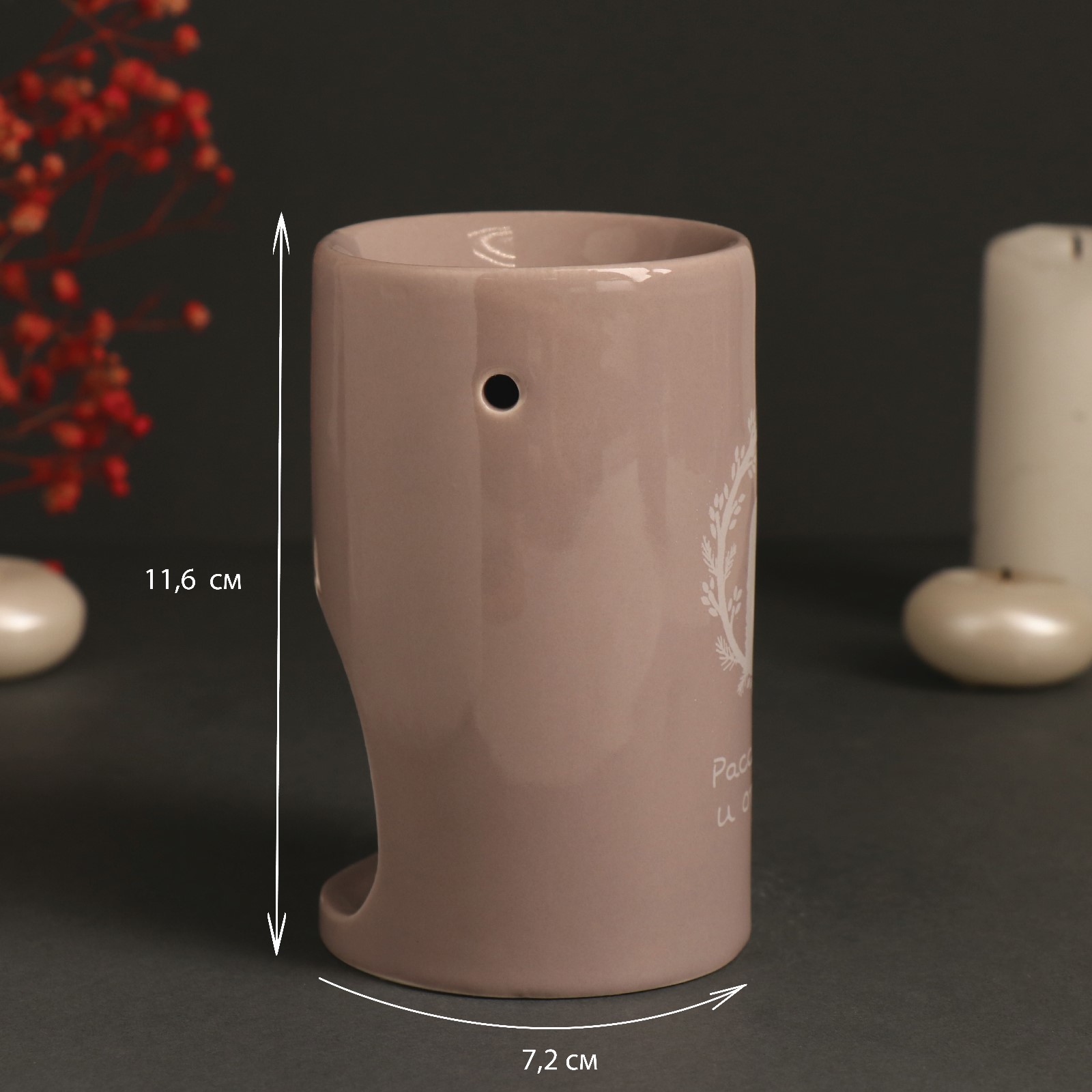 Аромалампа украшена вдохновляющей надписью "Расслабься и отдохни", напоминая о важности заботы о себе и необходимости делать паузы в повседневной жизни. Всего несколько капель эфирного масла и зажженная свеча под ней создадут атмосферу, наполняющую ваш дом волшебными и расслабляющими ароматами, способствующими глубокому отдыху и умиротворению.