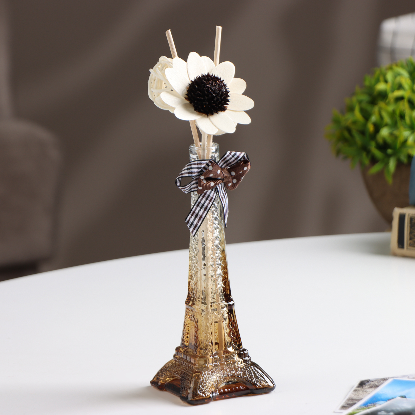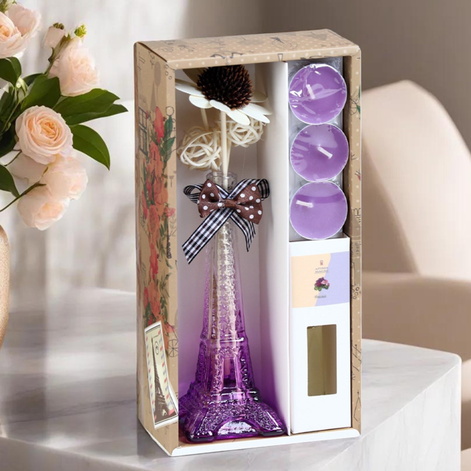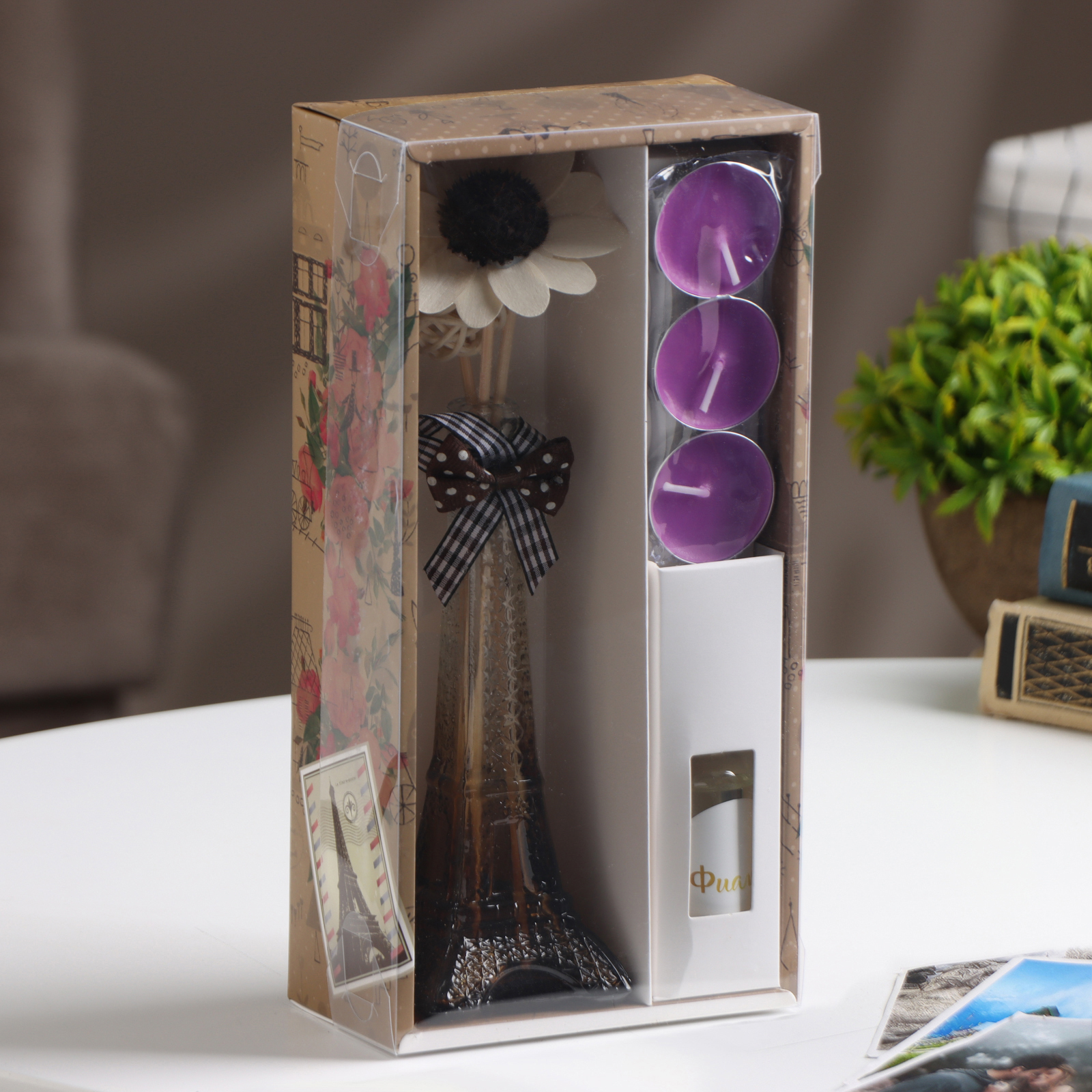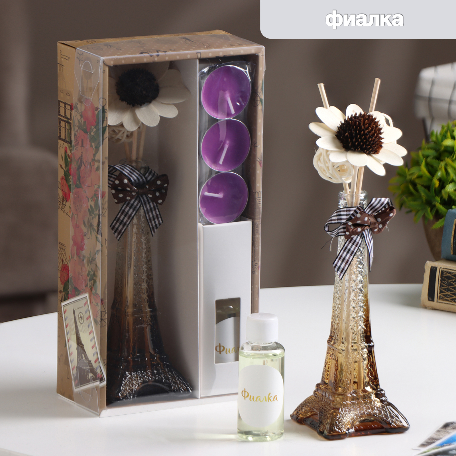 Изящный диффузор в форме Эйфелевой башни будет не только стильным элементом декора, но и источником нежного аромата, который создаст атмосферу спокойствия в вашем доме. Комплект дополняют уединенные чайные свечи, приглушающее освещение и умиротворяющее настроение.