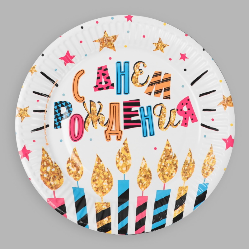 Тарелка бумажная С Днём рождения, Свечи и звёзды, набор 6 шт, 18 см
