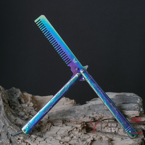 Расчёска бабочка это необычного вида нож, где вместо лезвия у него расческа. Отлично подойдет для тех, кто решил заняться флиппингом (необычные трюки с бабочкой), но не уверен или боится случайно порезаться в процессе обучения.