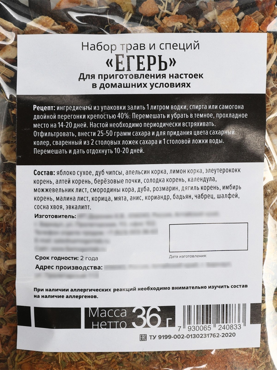 Общая масса нетто: 36 г — достаточно для приготовления полноценной настойки.